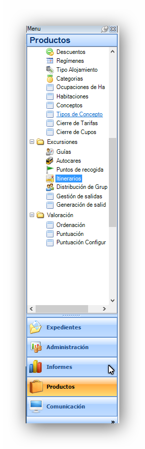 Accede al menú Productos >> Excursiones >> Itinerarios.