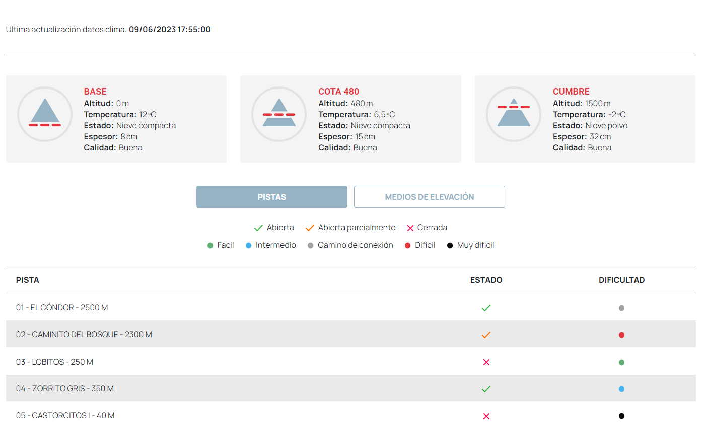 - Espesor nieve: campo numérico opcional. Si no se indica no se mostrará en la web.